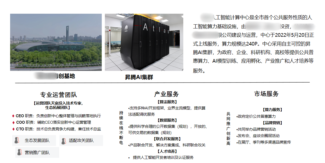 XX人工智能計(jì)算中心是該市首個(gè)公共服務(wù)性質(zhì)的人工智能算力基礎(chǔ)設(shè)施,中心采用自主可控的國產(chǎn)昇騰AI集群,為政府、企業(yè)、科研機(jī)構(gòu)、高校等提供公共普惠算力、AI模型訓(xùn)練、應(yīng)用孵化、產(chǎn)業(yè)推廣和人才培養(yǎng)等服務(wù)。