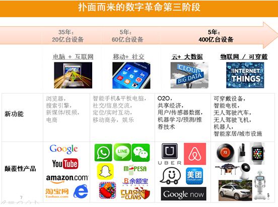 首先談一下全球的趨勢(shì)。如果我們回顧一下,40年前,那個(gè)時(shí)候其實(shí)還沒(méi)有什么PC的概念,但是過(guò)去這40多年我們看到了兩次巨大的革命,第一次我們可以稱(chēng)為是PC革命和因特網(wǎng)革命,這段時(shí)間,有20億臺(tái)的設(shè)備,讓我們很多人有PC,有手機(jī),開(kāi)始上網(wǎng),帶來(lái)了新的應(yīng)用,帶來(lái)很多了不起的全球公司。30年的努力之下,過(guò)去的五年就已經(jīng)把30年的發(fā)展變成是微不足道的,過(guò)去五年是移動(dòng)互聯(lián)網(wǎng)的崛起,以及整個(gè)社交網(wǎng)絡(luò)的崛起,這兩件事情不僅讓人聯(lián)上了PC,而且人聯(lián)上了人,隨時(shí)在網(wǎng),可以隨時(shí)隨地找到另外一個(gè)人的社交和溝通工具,這樣的一個(gè)革命,讓我們35年才看到了21億臺(tái)的設(shè)備,這五年成長(zhǎng)到60億,在這五年之內(nèi),我們經(jīng)過(guò)平板和智能手機(jī)就把過(guò)去的PC的革命,看起來(lái)非常微不足道。待會(huì)我們會(huì)再往下看,會(huì)看到未來(lái)的革命更巨大。世界領(lǐng)先的公司,在哪些方面改變了人們每一天的習(xí)慣,美國(guó)的公司、中國(guó)的公司真的是在領(lǐng)跑全球。過(guò)去看書(shū)可能是紙的書(shū),現(xiàn)在對(duì)年輕人來(lái)說(shuō)網(wǎng)上閱讀基本上取代了紙質(zhì)的書(shū)。最近的業(yè)界的合并,嘀嘀快的都已經(jīng)介入,改變了過(guò)去打車(chē)的方式。過(guò)去買(mǎi)東西,都是在實(shí)體的店,現(xiàn)在越來(lái)越到淘寶、天貓等購(gòu)買(mǎi)。過(guò)去拍照都是用很大的相機(jī),現(xiàn)在基本上用手機(jī),美圖秀秀這樣的軟件。支付的方式,原來(lái)是紙質(zhì),現(xiàn)在用余額寶,如果思考一下,回到十年前,把今天的小米手機(jī)交給十年前的你,告訴他這些東西怎么用,那個(gè)十年前的你,一定會(huì)非常驚訝,以為你是來(lái)自時(shí)光機(jī)器,或者科幻電影,怎么這么神氣?因?yàn)槲覀冇玫牧?xí)慣了,所以忘記了十年之內(nèi)革命性的改變,所以當(dāng)我們回顧過(guò)去的時(shí)候,不要認(rèn)為手機(jī)慢慢來(lái)的,其實(shí)它是非常快的速度改變提升了我們生活的細(xì)節(jié),改變了我們生活、工作、交朋友、購(gòu)物。我們做的事情,已經(jīng)被移動(dòng)互聯(lián)網(wǎng)顛覆了,這是今天發(fā)生的事情。