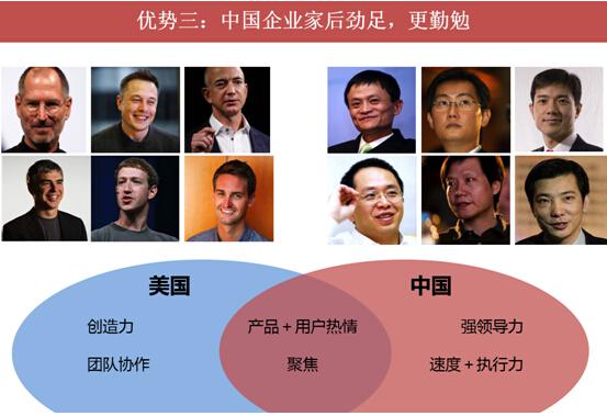 第一,更多的移動(dòng)互聯(lián)網(wǎng)后發(fā)優(yōu)勢(shì)。中國(guó)網(wǎng)民只達(dá)到總?cè)丝诘?8%,美國(guó)是80%,互聯(lián)網(wǎng)尚未普及的中國(guó)四線(xiàn)城鎮(zhèn)和農(nóng)村有巨大的移動(dòng)互聯(lián)網(wǎng)潛力;中國(guó)大中型城市人口稠密,服務(wù)業(yè)水平不高,是共享經(jīng)濟(jì)、數(shù)字娛樂(lè)等移動(dòng)互聯(lián)網(wǎng)核心領(lǐng)域的最佳實(shí)驗(yàn)室和最大舞臺(tái);中國(guó)是制造業(yè)大國(guó),為智能硬件和物聯(lián)網(wǎng)提供了低成本迭代、暴量的機(jī)遇。
