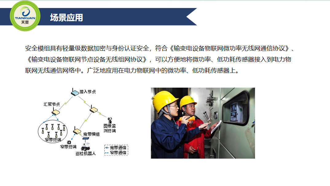 物聯(lián)網加密模組基于《輸變電設備物聯(lián)網微功率無線網通信協(xié)議》、《輸變電設備物聯(lián)網節(jié)點設備無線組網協(xié)議》,具有標準NB-IoT通訊能力,在模組中內嵌密鑰生成、密碼運算能力,可實現(xiàn)身份認證、數據加解密功能,同時具有功耗小、成本低、無額外芯片、無需修改硬件設計、安全功能開發(fā)簡潔等優(yōu)勢??梢苑奖愕貙⑽⒐β?、低功耗傳感器接入到電力物聯(lián)網無線通信網絡中。廣泛地應用在電力物聯(lián)網中的微功率、低功耗傳感器上。