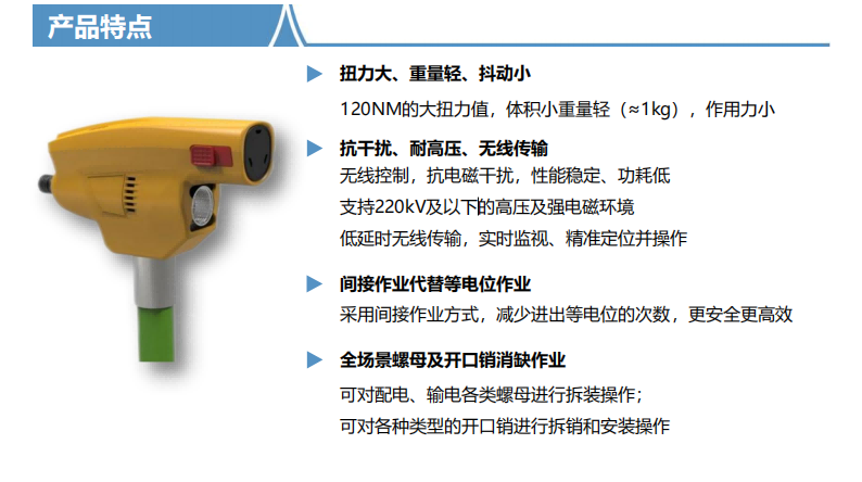 及以下帶電作業(yè)的智能消缺工器具,具有可視化、可遙控、體積小重量輕、操作便捷的特點,優(yōu)化高空檢修作業(yè)程序,節(jié)能提效。